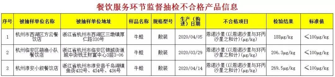 杭州市西湖区方云餐饮店(西湖区三墩镇厚仁路330号)销售的1批次牛蛙恩诺沙星超标不合格;
