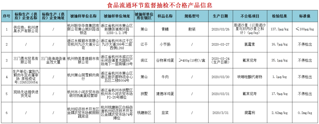 杭州市小河农贸市场胡效妫禽蛋经营部(拱墅区杭州市小河农贸市场F2-25号摊位)销售的1批次建德洋鸡蛋检出氟苯尼考不合格;